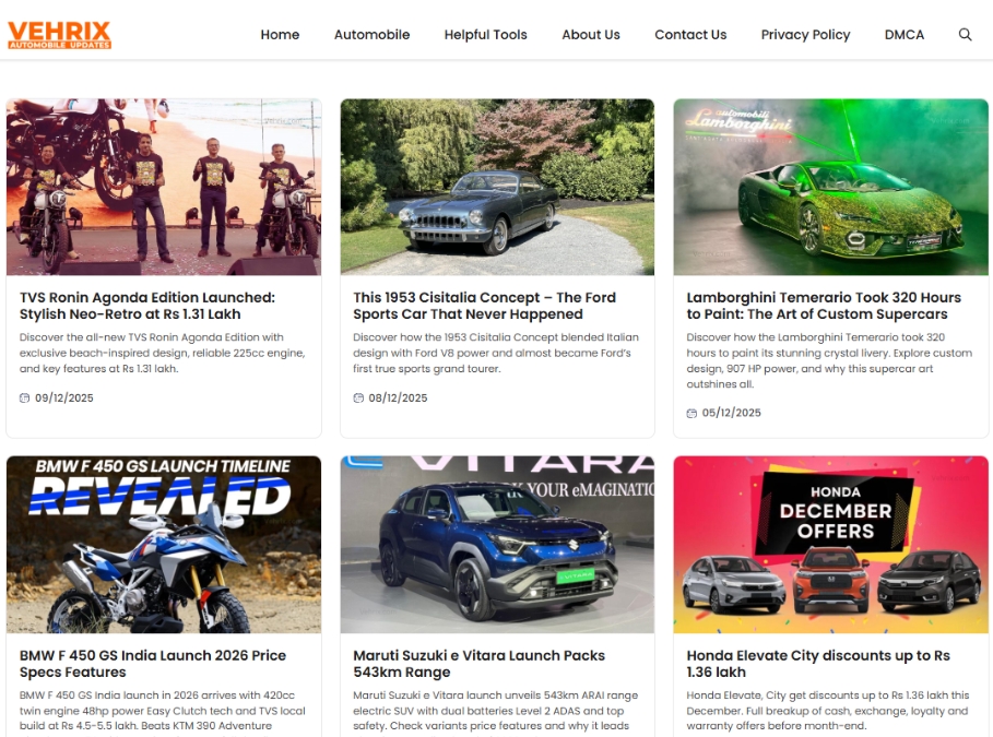 This listing is for Vehrix.com, a professionally designed automobile updates website built with a premium, unique template and original, handwritten content in the evergreen automotive niche. The site is just 2 months old and offers a clean foundation with strong long-term growth and monetization potential.